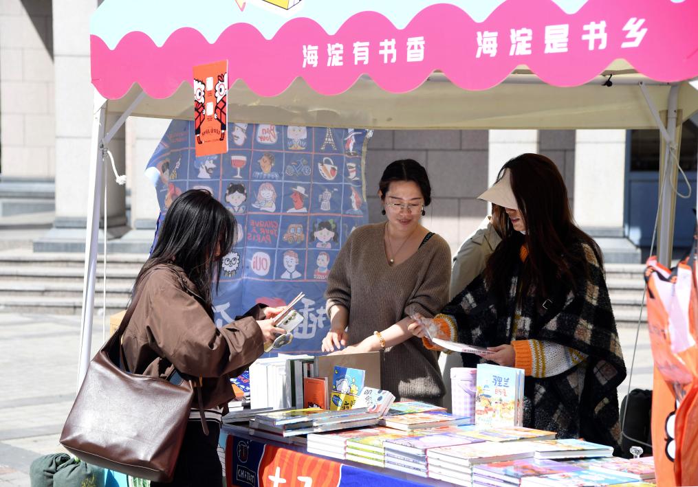 4月20日,在北京大学,学生(左)在“旧书新知·读书育人”活动现场挑选图书。