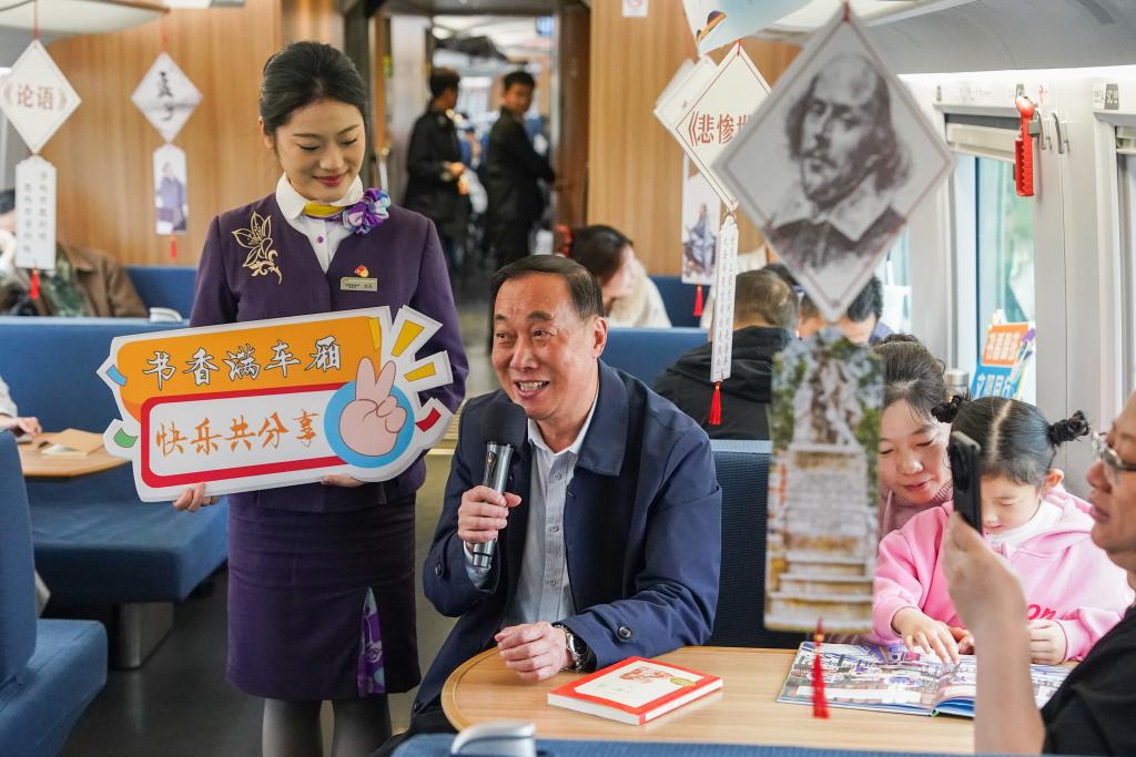 4月20日,旅客在G7378次列车上举行的“书香伴高铁 阅读润旅途”列车阅读会上分享读书心得。