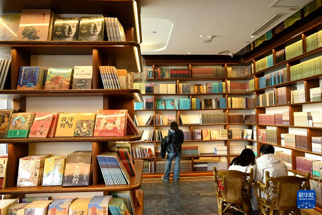 4月20日,人们在甘肃省敦煌书局阅读图书。