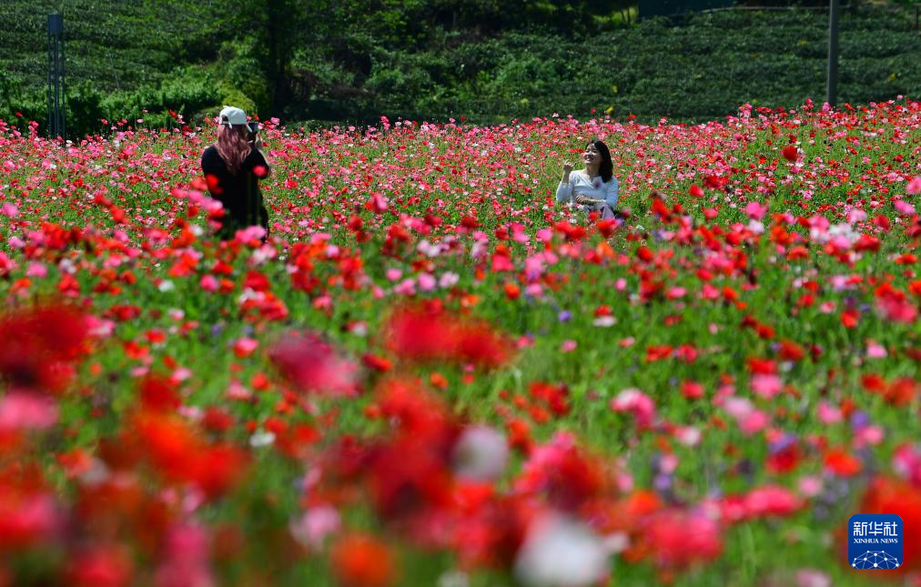 4月25日,人们在江苏无锡一处花海拍照赏花。